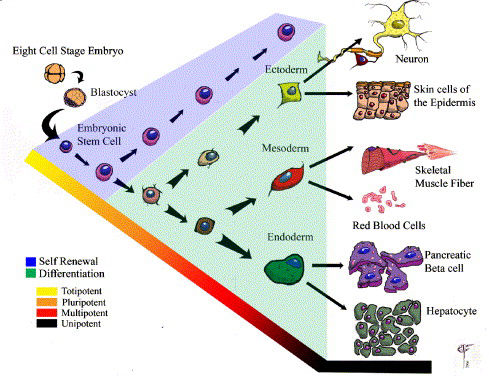 The embryonic stem cell (ESC) is defined by its origin—the inner cell mass of the blastocyst. ESCs traditionally differ from adult stem cells in that they are deemed pluripotent; meaning they can give rise to cells derived from all three germ layers. Gene expression patterns observed during the in vitro differentiation of ESCs mimic that seen in vivo; and these cells can give rise to numerous cell types in vitro including neurons, bone, pancreatic islets, and skeletal muscle.
